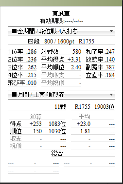 東風戦でなぜかほとんど勝てなくなりました。ですが、東南戦では普通に勝っていき三段から四段に戻れるくらいは勝てました。