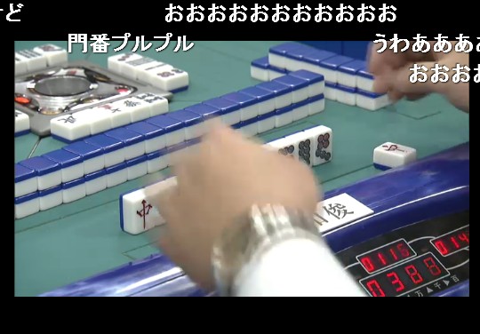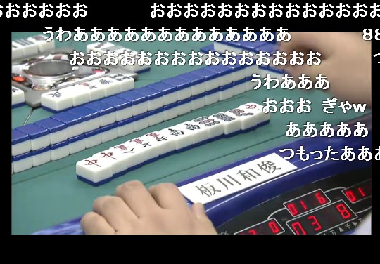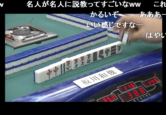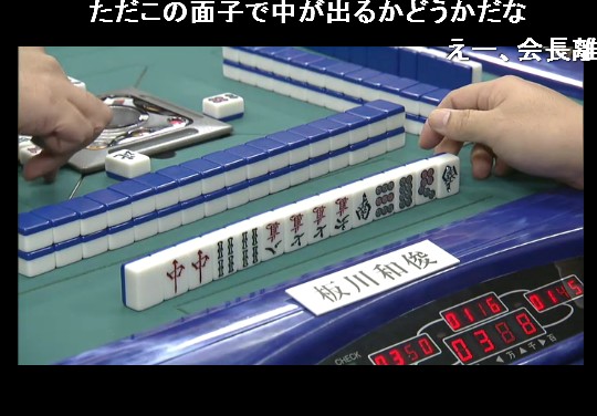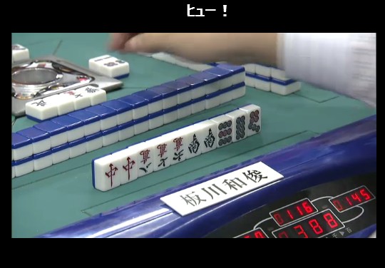 そして、板川選手が灘選手から4索をポンして南・中のダブルバックの和了れば優勝のテンパイ。